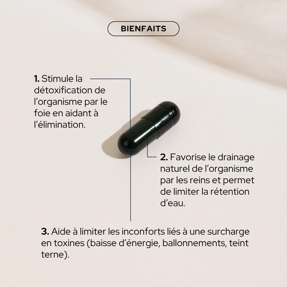 • Aide à limiter les inconforts liés à une surcharge en toxines (baisses d’énergie, ballonnements, teint terne)